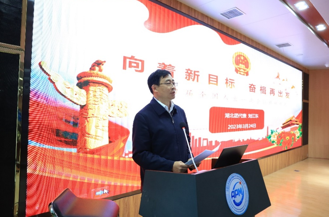 会上,刘江东做题为《向着新目标 奋楫再出发——十四届全国人大一次会议精神传达》专题报告,传达了习近平总书记在人大会议期间重要讲话精神,详细的介绍了会议概况、会议成果、政府工作报告、湖北代表团参会建议等情况。他表示,习近平总书记在讲话中强调,高质量开展是全面建设社会主义现代化国家的首要任务;加快实现高水平科技自立自强,是有助于高质量开展的必由之路;有助于高质量开展,必须坚持和加强党的全面领导、坚定不移全面从严治党。大会的胜利召开为实行今后各项工作给予了根本遵循,我们要深入贯彻二十大精神,学习贯彻全国两会精神,加快建设全国构建新开展格局先行区,奋力谱写新时代湖北高质量开展新篇章。
