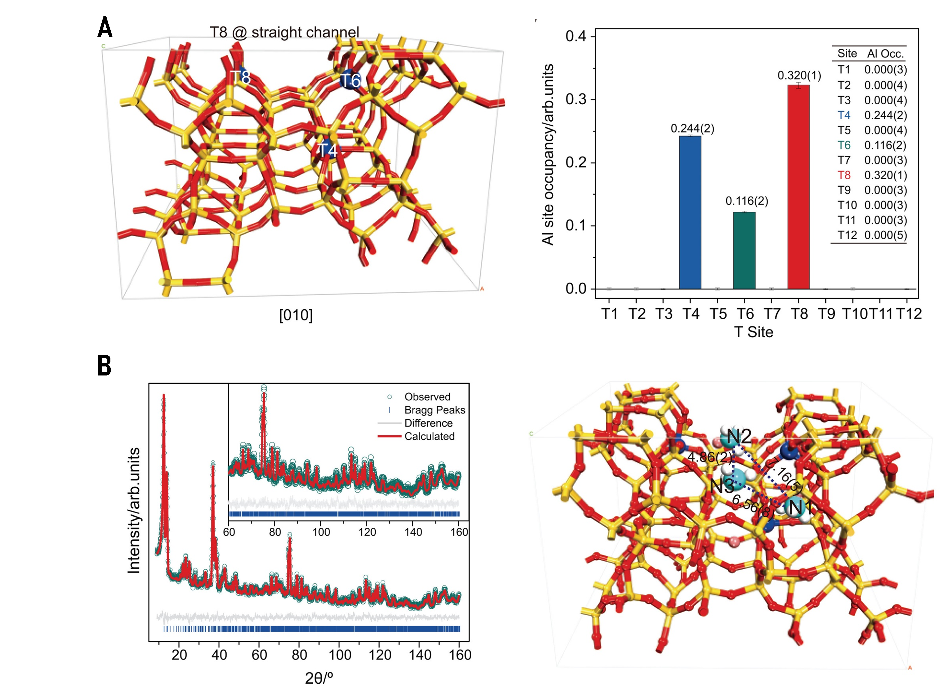沸石分子筛作为一种多孔晶体材料,可顺利获得Al原子取代惰性Si原子占据T位取得可调变的活性中心,在石油化工、生物质转化和精细化工等各种催化过程中得到广泛应用。Al原子的落位与分布决定了沸石分子筛的活性和催化位点,进而影响其物理化学特性及催化性能,精确测定活性中心在分子筛中的具体位置是分子筛研究领域长期以来的重大挑战。